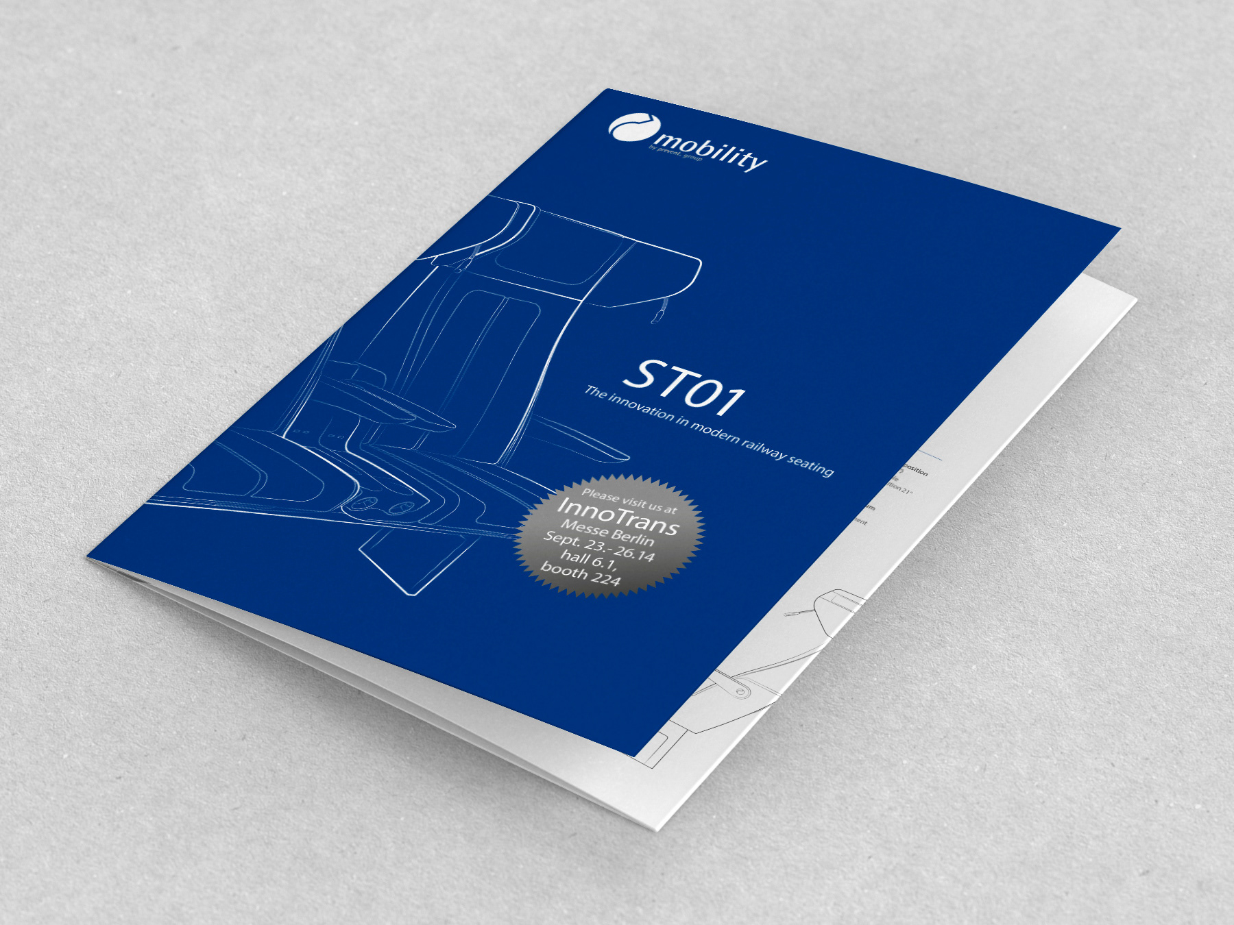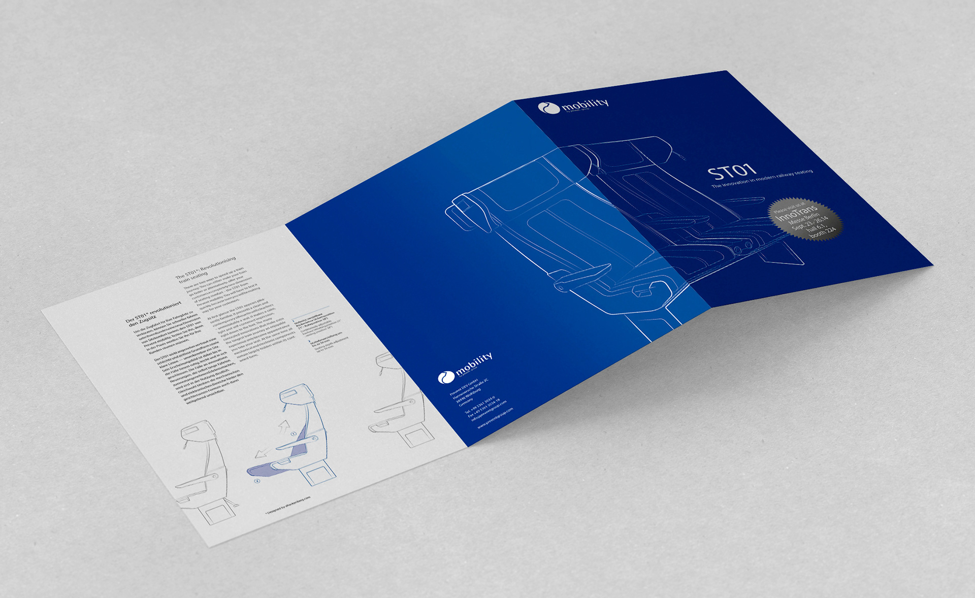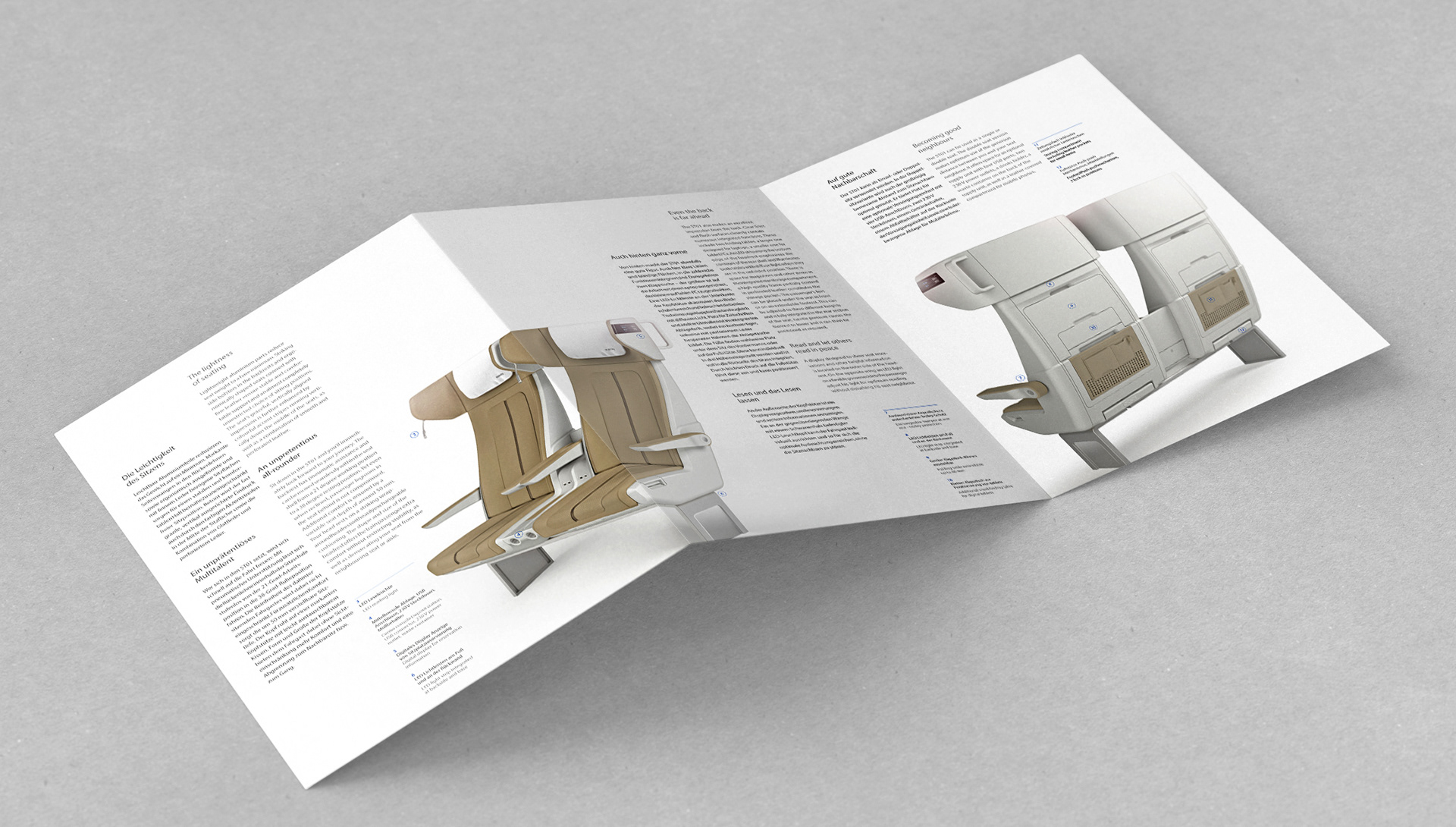 6-page, bilingual brochure (German/English) for an innovative train seat concept (2020). Product design and renderings were created by "ahackenberg design".